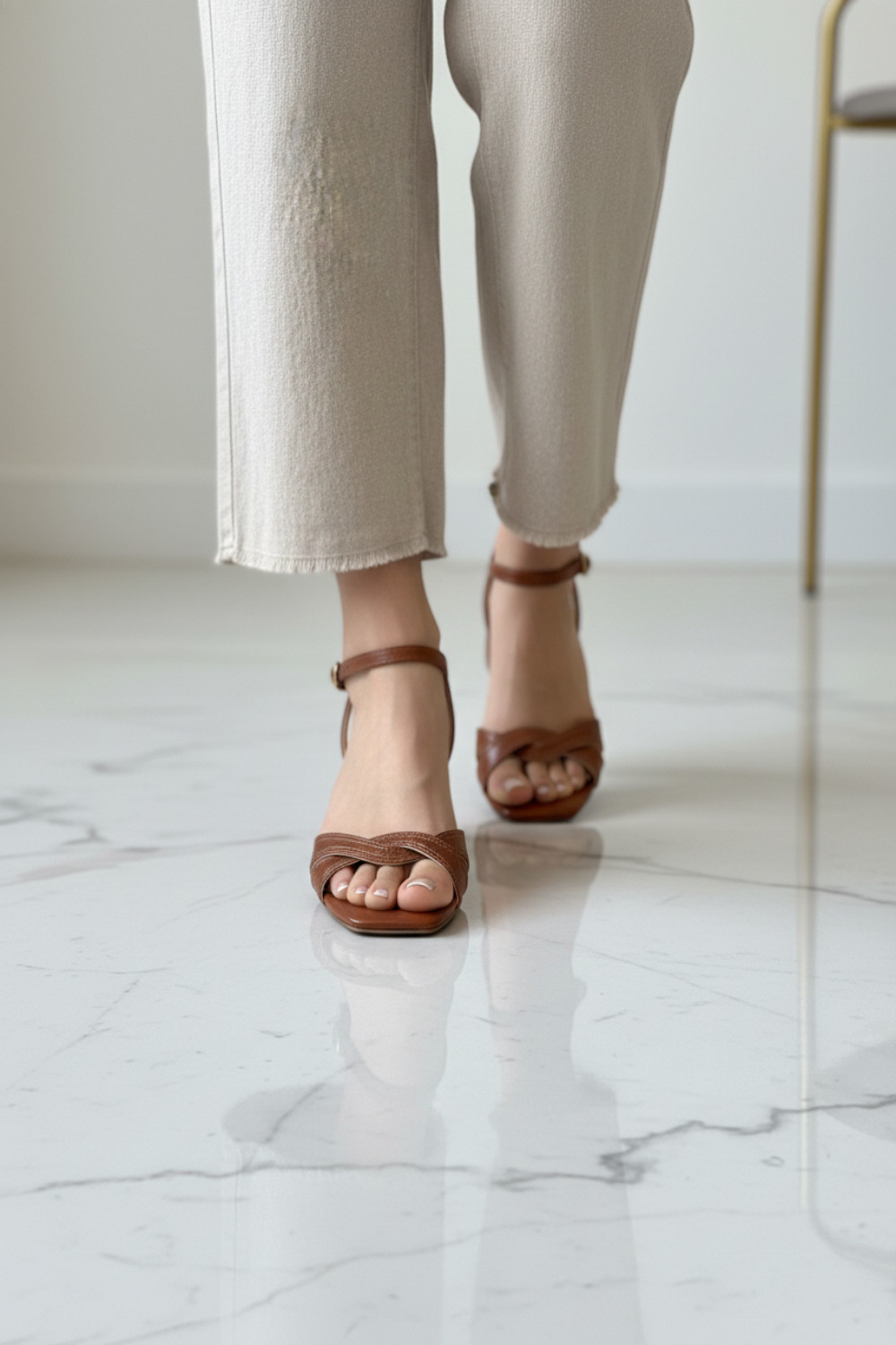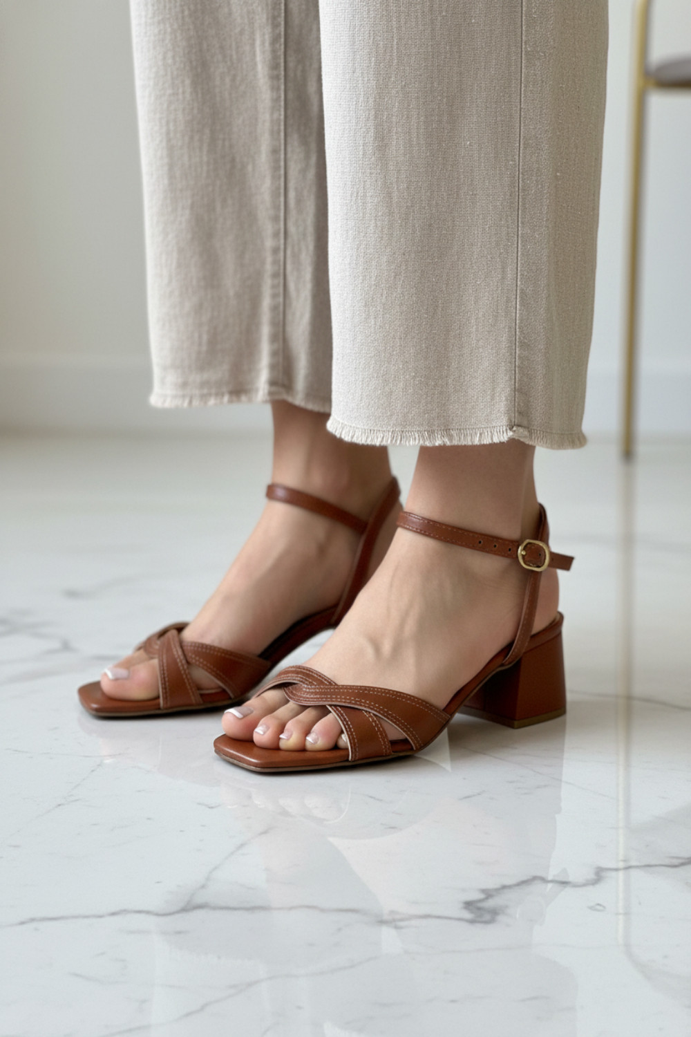 Esta sandália sofisticada apresenta um design moderno com tiras entrelaçadas sobre o peito do pé e uma elegante tira ajustável no tornozelo, adornada com uma fivela dourada discreta. Confeccionada em material sintético de alta qualidade na cor caramelo, ela oferece um visual atemporal. O bico quadrado contemporâneo e o salto bloco baixo garantem o máximo de conforto e estabilidade a cada passo. Seu estilo versátil a torna a escolha perfeita para completar looks variados, do casual ao mais arrumado, adicionando um toque de refinamento.